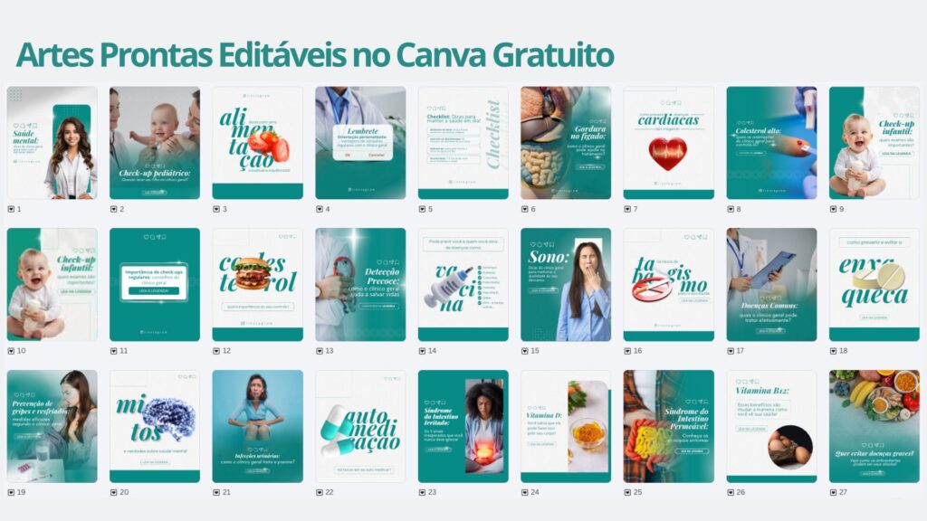 Com o Pack Canva Clínico Geral, é possível unir informação de qualidade, identidade profissional e consistência visual — fatores indispensáveis para quem deseja se destacar no meio digital. Em vez de perder horas tentando criar posts do zero, o médico encontra templates prontos com legendas estratégicas, que explicam temas relevantes para o público leigo de forma simples e atrativa.