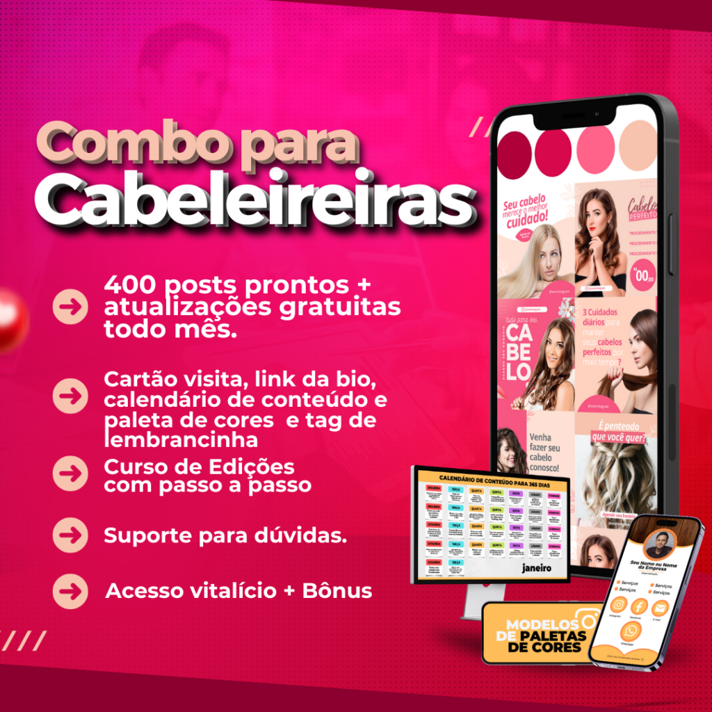 O Pack Canva para Cabeleireiro foi criado justamente com esse objetivo: facilitar a criação de conteúdo profissional, melhorar a aparência do seu perfil e ajudar você a atrair mais clientes todos os dias.