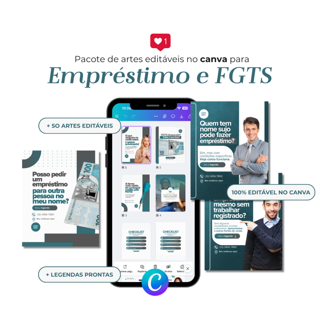 O Pack Canva Empréstimo e FGTS surge exatamente para esse propósito: facilitar a vida de quem trabalha com crédito, empréstimos, FGTS, consignado e finanças pessoais. Ele entrega posts e legendas prontas, 100% editáveis, em formatos otimizados para o Instagram, com design profissional e mensagens que despertam interesse e engajamento.