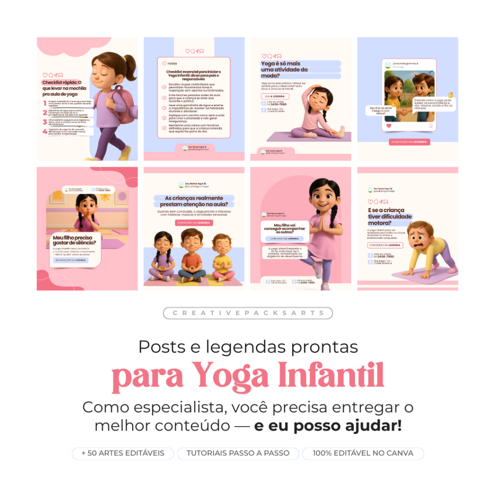 O Pack Canva para Studio de Yoga foi criado exatamente para ajudar nisso: facilitar a criação de posts profissionais, melhorar a aparência das suas redes sociais e ajudar seu studio a atrair mais alunos.