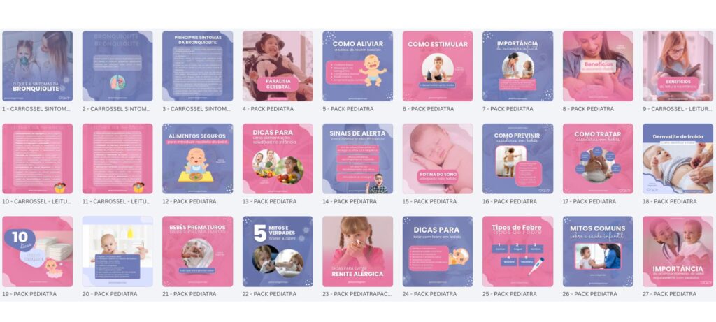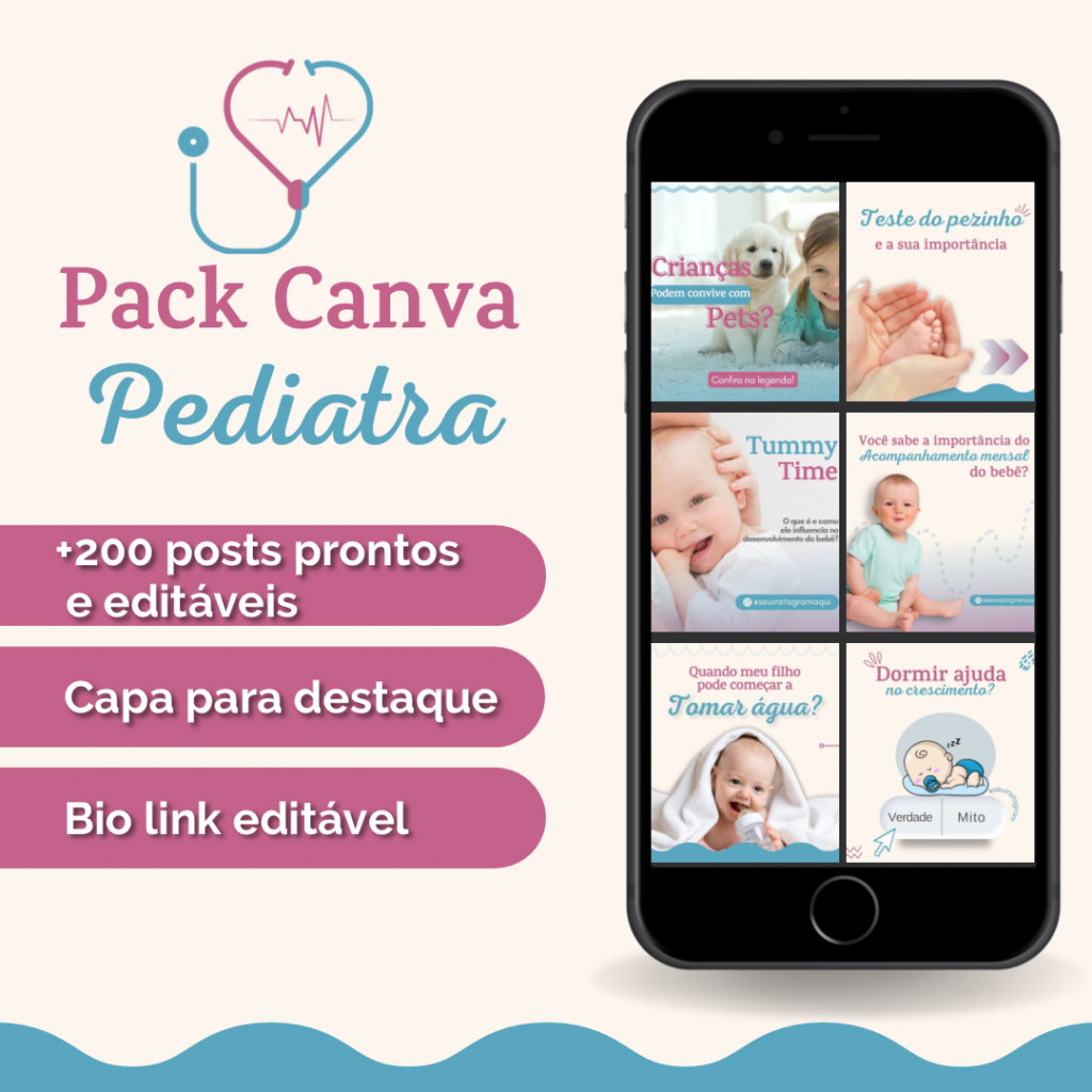 Além disso, você verá como é possível transformar suas redes sociais em uma poderosa vitrine profissional usando o Pack Canva Pediatra, com mais de 200 posts prontos e editáveis, todos no estilo exibido nas imagens enviadas.