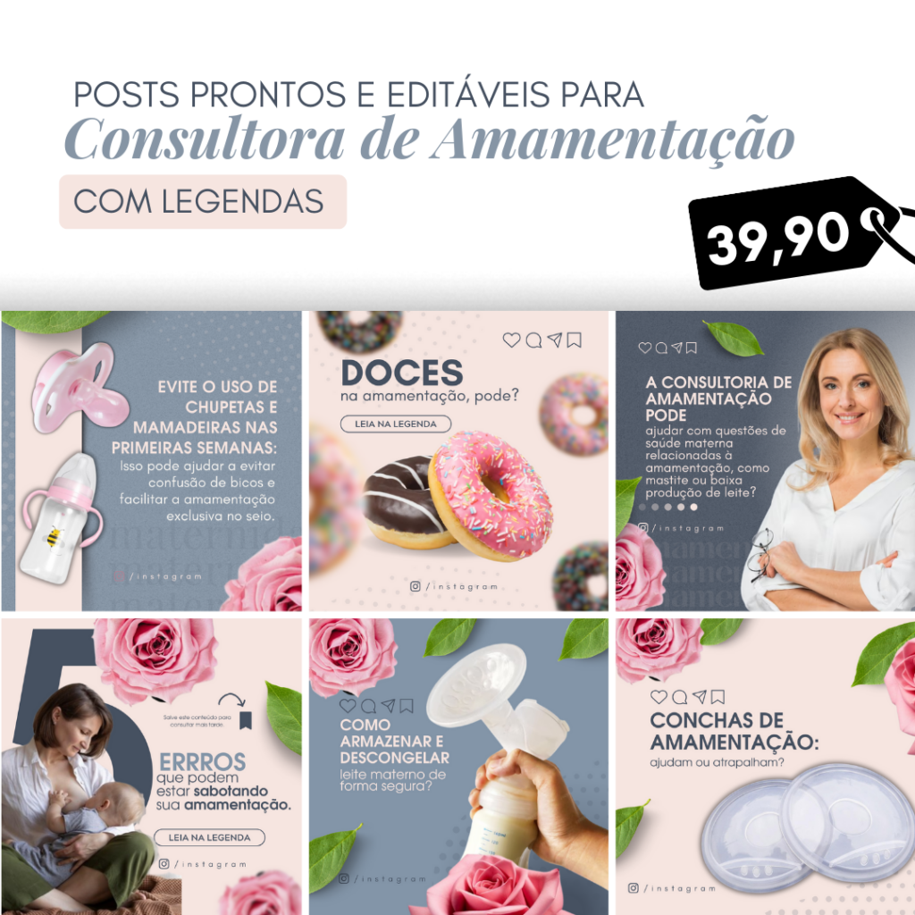 Além de trazer um conteúdo extremamente aprofundado, este guia também mostra como você, profissional, pode elevar o nível da sua presença digital, atrair mais clientes e conquistar autoridade utilizando o Pack Canva para Consultoras de Amamentação, que contém +200 posts totalmente editáveis, capas de destaques, bio link e cartão de visita.